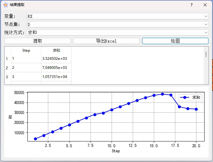 我们在做强度分析的时候,经常采用位移控制加载的方法。这时,为了得到加载载荷,需要把反力提取出来。为此,我设计了一个专门的结果提取弹窗,可以针对预设的节点集进行位移、应力、反力等变量的提取和运算(最大值、最小值、平均值、求和)。