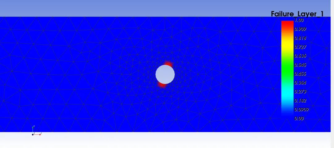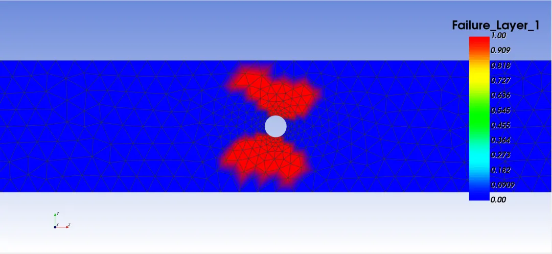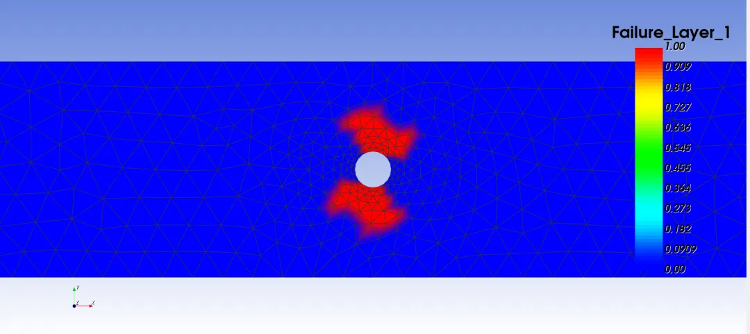 渐进失效模拟的思路是:在每一级加载后,可以把应力或者应变代入失效准则,从而判断单元是否失效,如果单元失效,我们将这个单元的性能做折减。随着失效单元的数量变多,结构失去承载能力。