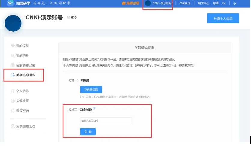 3、登录个人账号后,在研学平台“个人中心”,选择“关联机构团队”,在关联处输入口令(口令请联系图书馆老师获取),关联成功后出现学校名称即可正常使用。