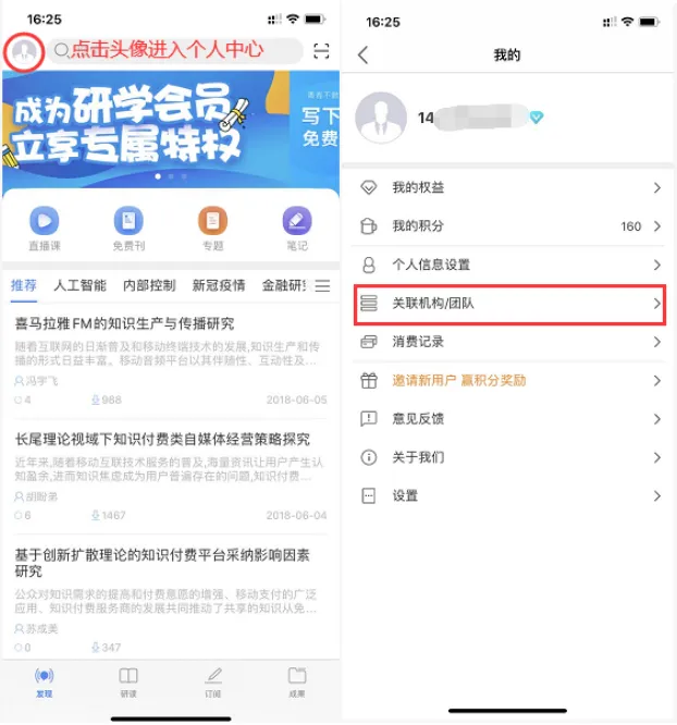 手机端下载“知网研学”app,新用户通过手机号码注册个人账号,在个人中心“关联机构/团队”,(注:如已在网页端绑定,手机端无需再次绑定)