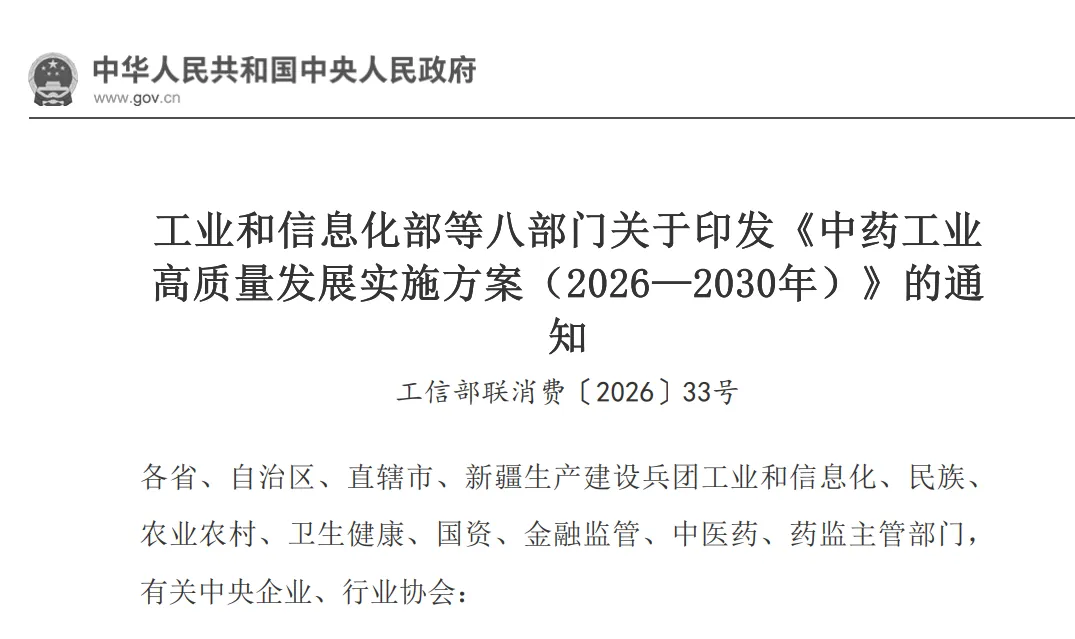 工业和信息化部、国家民委、农业农村部、国家卫生健康委等八部门联合印发《中药工业高质量发展实施方案(2026—2030年)》(以下简称《实施方案》),作为未来五年中药工业发展的纲领性文件,明确将人工智能、大数据等新一代信息技术作为核心赋能手段,聚焦中药研发、生产全链条,提出构建特色方剂知识图谱、推动AI深度融合应用的重点任务,为中药工业转型升级划定清晰路径。