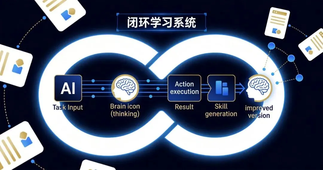 它构建了完整的闭环学习循环:接收任务并执行后,会自动评估结果质量,将成功的流程提炼为标准化的Skill文档(可复用技能包)。后续遇到同类任务,直接调用对应Skill,无需重复摸索,效率翻倍。