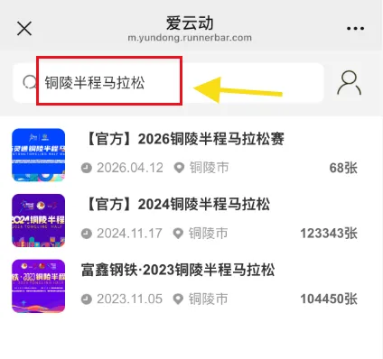 途径2,查找微信公众号爱云动点击关注,在公众号底部菜单栏【选手相册】,点击后,在搜索栏输入铜陵半程马拉松,获得赛事相册,点进赛事相册,输入自己的号码牌(或人脸识别),即可找到自己的比赛照片哦~