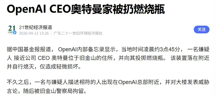 这就不难解释前两天发生的另一个标志性事件:一名20岁的年轻人向OpenAI CEO Sam Altman的住宅投掷了燃烧瓶,并威胁要烧毁OpenAI总部。Altman事后坦言自己“低估了舆论叙事的影响力”。当指数级进化的AI技术撞上普通人线性的认知时,恐慌便化作了暴力与抵触。