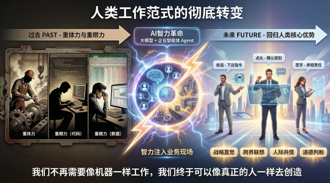 复杂的系统终端操作、代码编写、甚至海量客户的初步语音沟通,正在被自动化工作流全面接管。 - 解放脑(剥离战术级脑力):