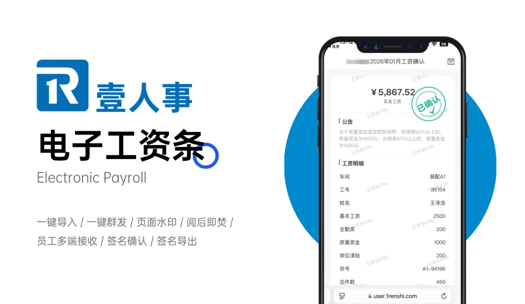 算笔账:一家100人的公司,如果每月打印纸质工资条,A4纸+硒鼓+打印机折旧+HR半天工时,成本至少200元/月,一年就是2400元。而使用壹人事电子工资条,一年仅360元,还省去了HR两天的工作量,同时获得了合规签收、安全存证、员工自助查询等增值价值。哪个更划算,一目了然。