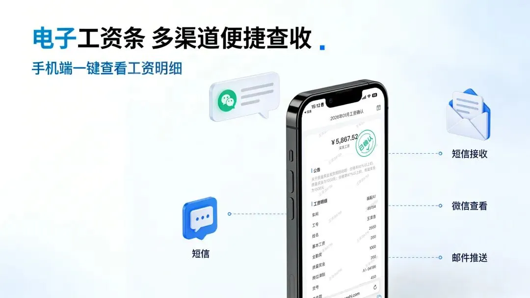 传统的纸质工资条不仅耗费纸张、油墨和HR大量时间,还存在三大硬伤:分发效率低(几百人需要半天)、签收难追溯(员工丢了不认账)、隐私易泄露(工资单随手放)。而微信工资条通过短信或微信直接推送到员工手机,一对一私密查收,还能在线签名确认,完美解决了上述痛点。