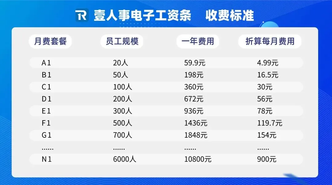 回到大家最关心的问题——“便宜”。壹人事采用简洁的人数套餐制,无隐藏费用,年费价格远低于纸质工资条的打印、耗材和人力成本: