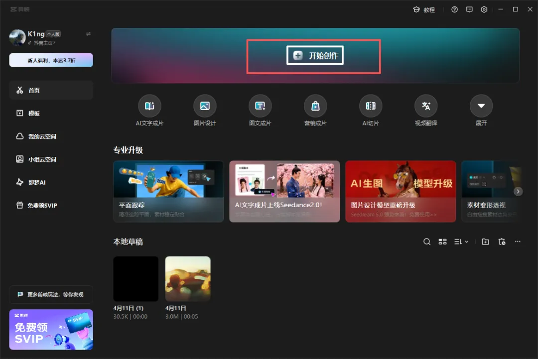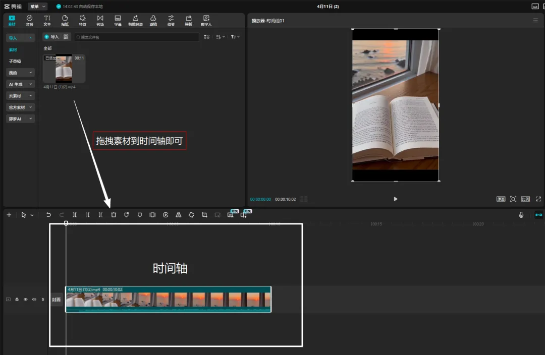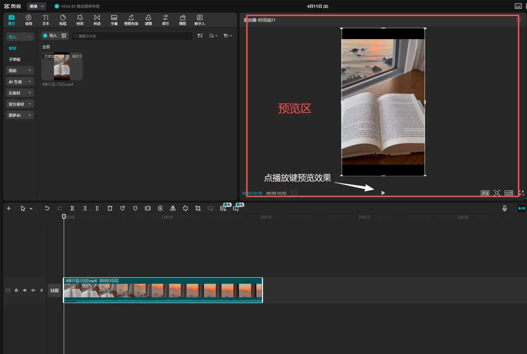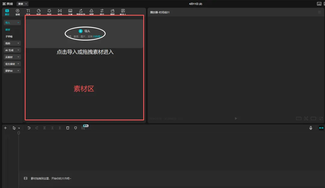 素材区:打开剪映,点击首页的「开始创作」,就能导入咱们昨天拍好的素材,所有导入的视频、图片都会在这里显示,想选哪个直接点就行。