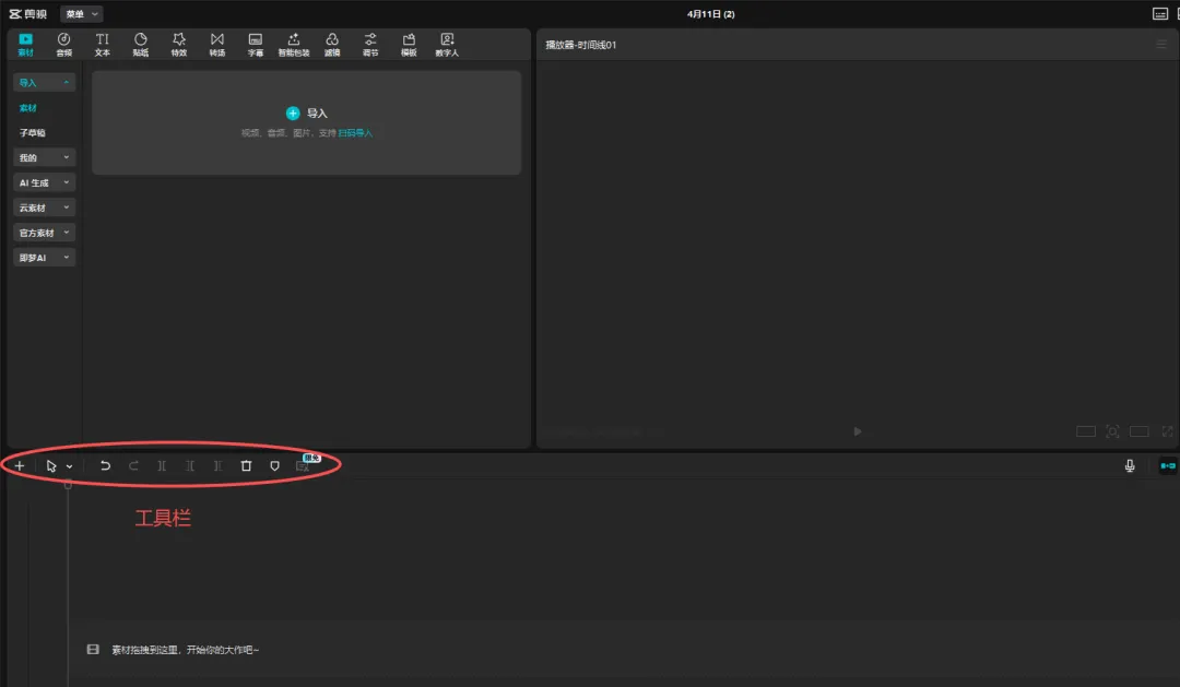熟悉剪映的4个核心界面,试着点击工具栏的各个按钮,不用实际剪辑,只要记住每个按钮的位置就可以。
