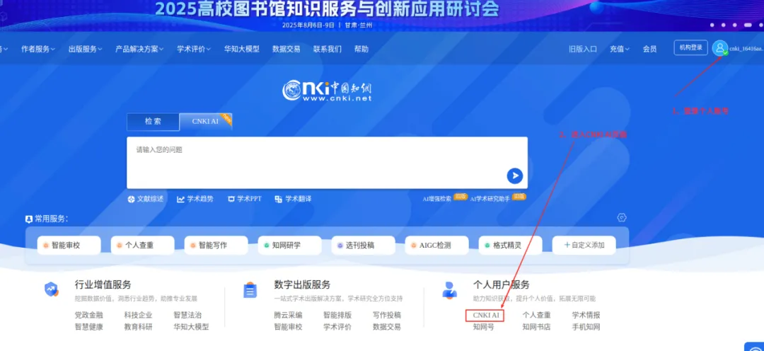 在学校IP范围内,进入知网首页www.cnki.net,用个人账号登录,选择CNKI AI进入;你也可以直接输入https://ai.cnki.net/进入并登录个人账号。登录个人账号后即可使用。