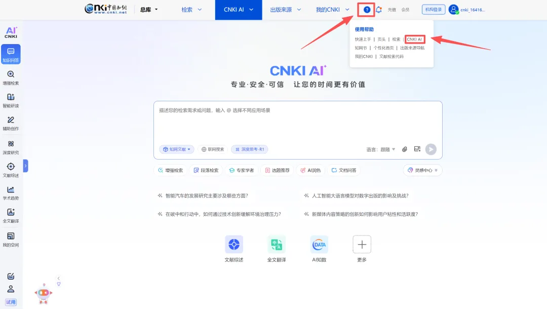 进入CNKI AI页面后,在页面上方“?”符号(使用帮助)处获取使用说明,如下图所示。