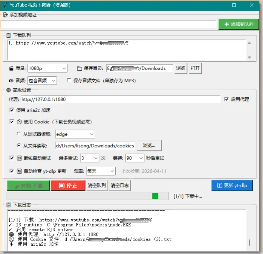 A:首先点击「⬆ 更新 yt-dlp」按钮,更新到最新版本。YouTube 频繁改版,旧版 yt-dlp 可能已失效。更新后重试。如果还不行,你把代码文件和错误信息扔给claude,让它帮你解决,通常我都是这么做的。