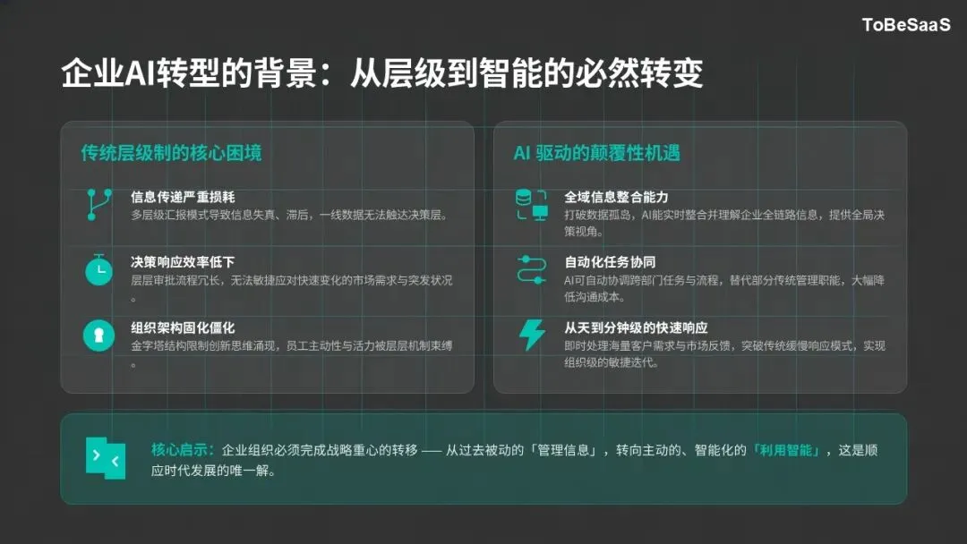 因此,企业AI转型必须建立一套清晰的核心逻辑:以“组织层面核心能力提升”为终极目标,以解决传统层级制困境为切入点,摒弃“零散应用AI”的思维,构建一套系统化、可落地的智能架构,让AI、人、业务形成协同合力,而非各自为战。