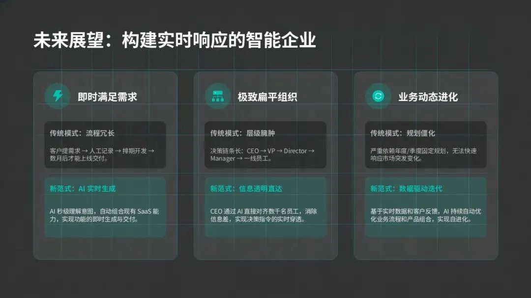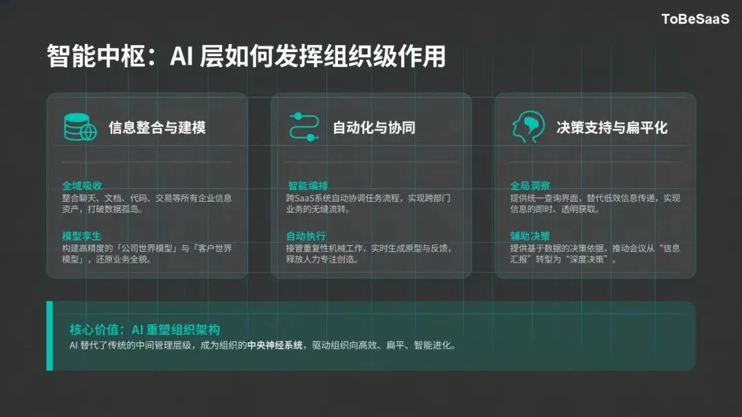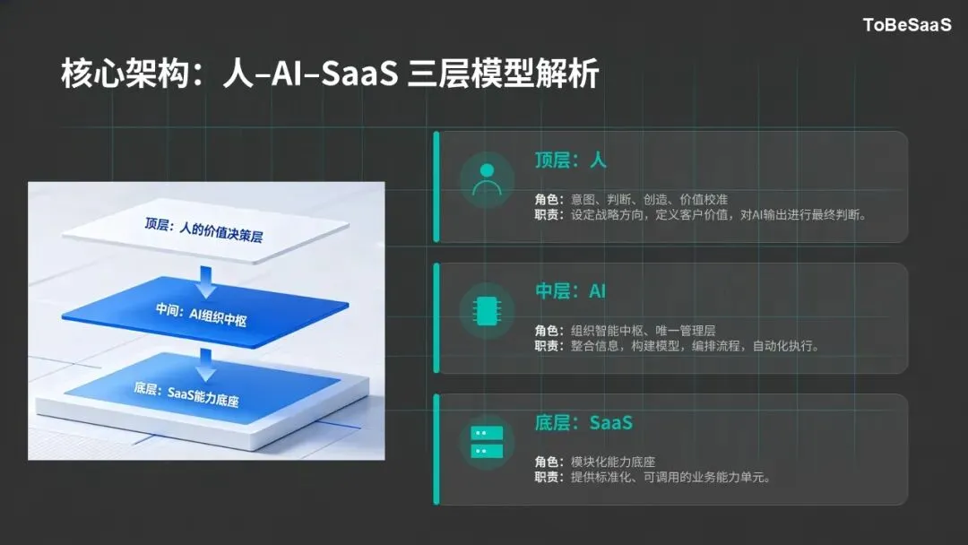 SaaS提供标准化的能力底座,解决了企业基础能力的有效供给问题;AI作为组织中枢,解决了传统组织的信息黑箱、速度不均、内耗严重等痛点,实现组织可读性提升与整体输出最大化;人作为价值核心,为整个架构提供方向指引与价值校准,确保组织创新活力与发展方向的正确性。
