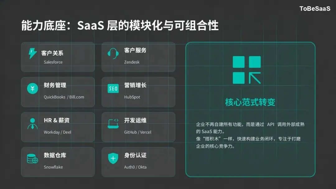 底层由现有SaaS工具与各类软件构成,它们共同组成了可调用的标准化、模块化的业务能力单元,为整个架构奠定基础。