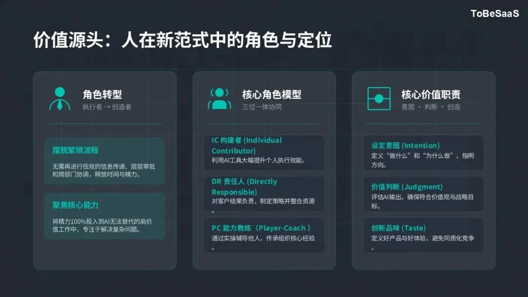 架构的顶层是人的价值决策层,也是整个架构的方向指引核心。在这一架构中,传统中层管理者的作用被大幅替代,仅保留三类核心角色:
