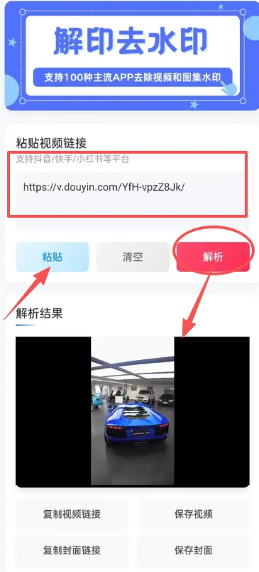 刷到心仪短视频,点击分享→复制链接→打开解印→粘贴链接→一键解析,3 秒即可完成无水印视频下载。