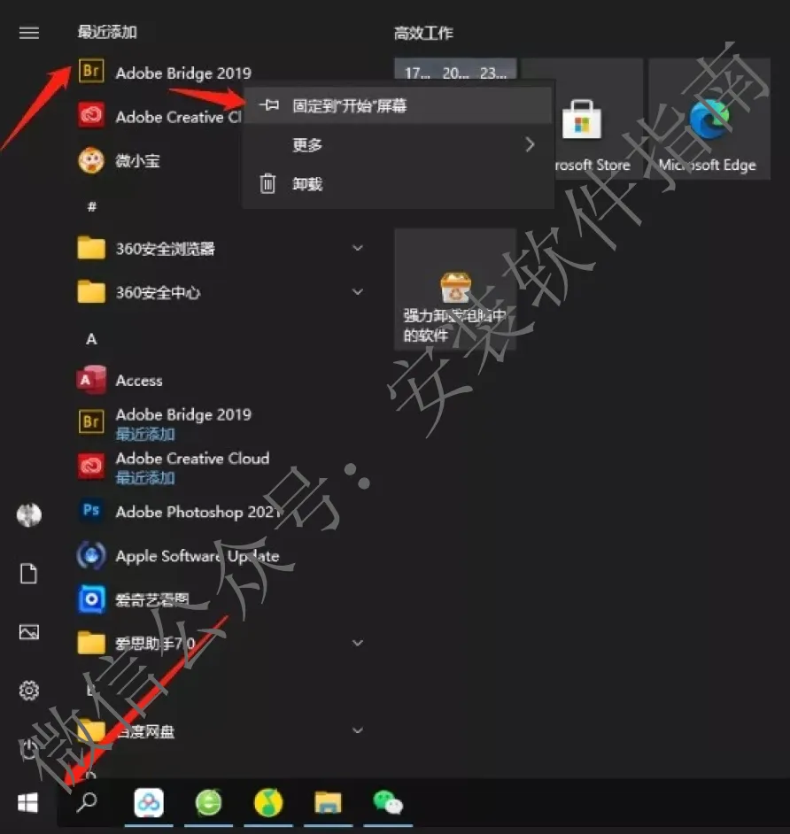 7.点击左下角的微软图标找到对应的软件固定到开始屏幕
