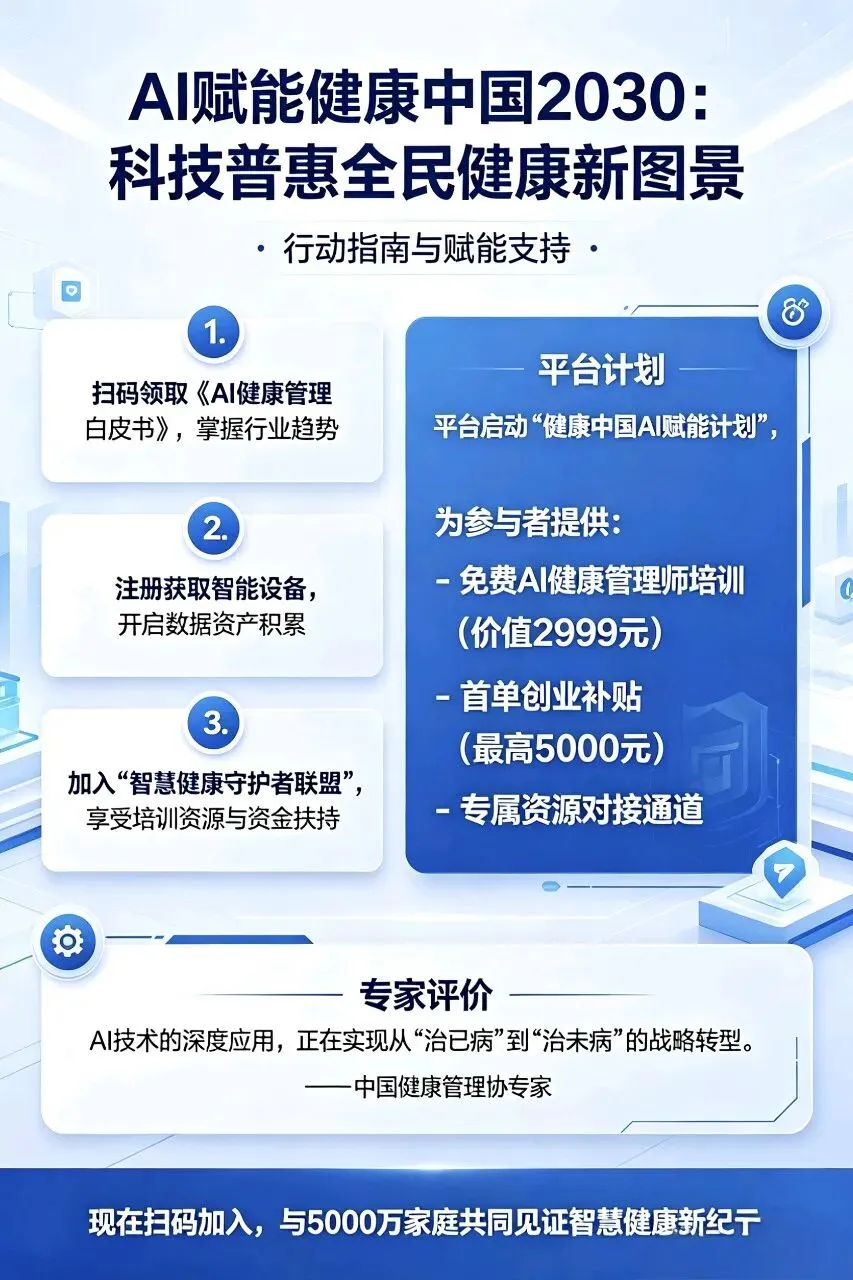 中国健康管理协会专家评价:"AI技术的深度应用,正在实现从'治已病'到'治未病'的战略转型。"现在扫码加入,与5000万家庭共同见证智慧健康新纪元。毕竟,真正的健康中国,需要科技力量的精准赋能,更需要全民参与的生态共建。