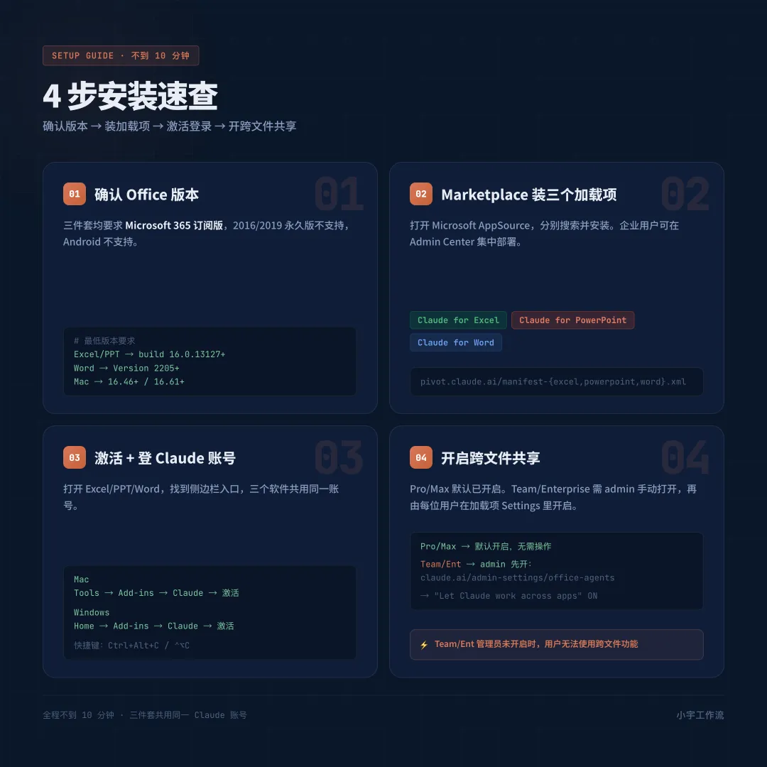 还有一个容易踩坑的点。Pro/Max 的跨文件共享默认是开的,Team/Enterprise 默认是关的,需要 admin 进入 claude.ai/admin-settings/office-agents 手动打开。