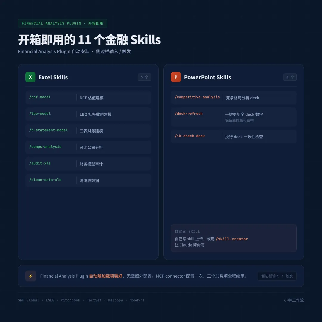 /dcf-model DCF 估值建模•/lbo-model LBO 建模•/3-statement-model 三表财务建模•/comps-analysis 可比公司分析•/audit-xls 模型审计•/clean-data-xls 清洗脏数据你也可以自己写 skill 上传,或者用 /skill-creator 让 Claude 帮你写。