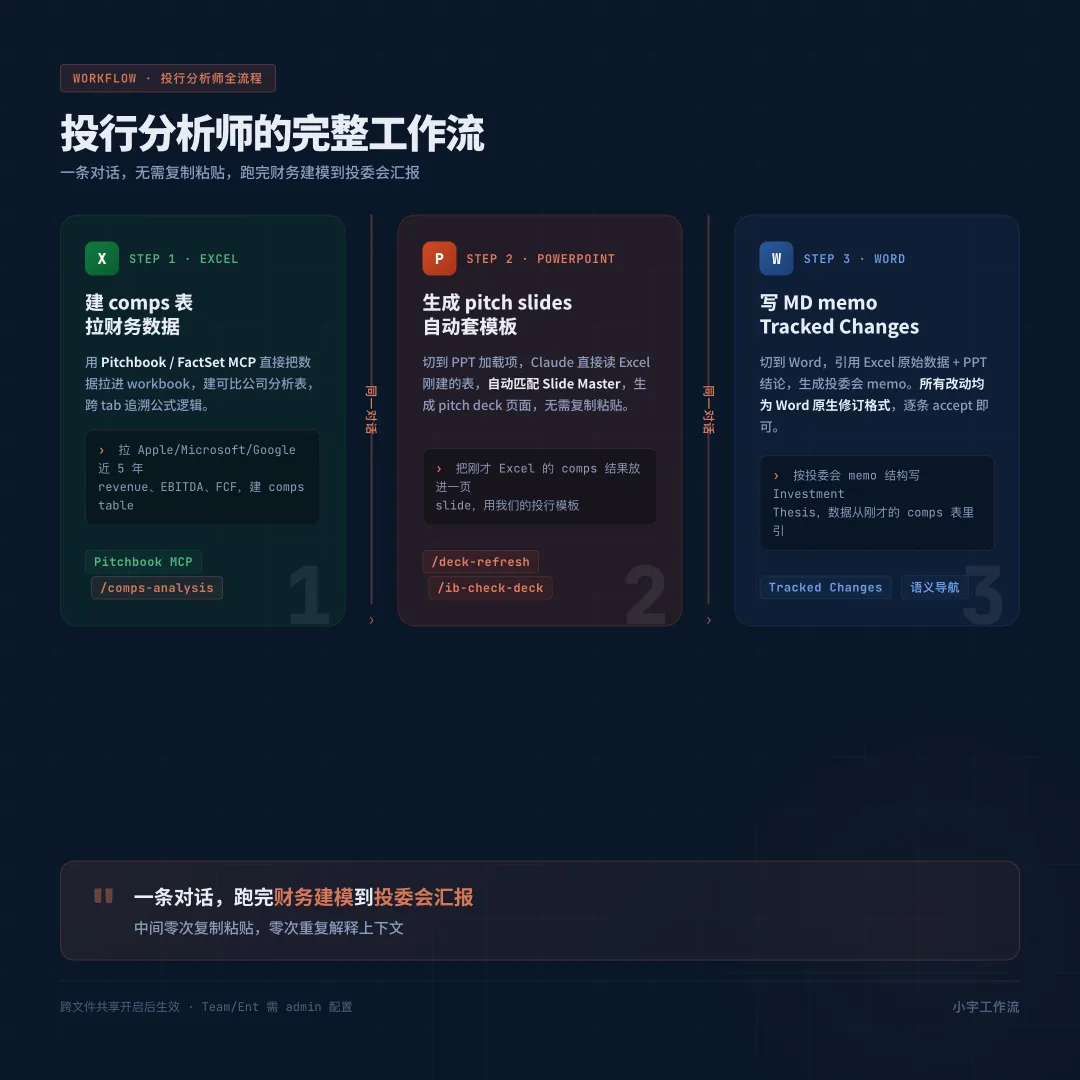 举个例子你就懂了。一个投行分析师要做一份 pitch deck。以前的流程是这样的,先在 Excel 里跑 comps 分析建模型,然后截图或导出数据,切到 PowerPoint 里一张一张 slide 拼出来,最后打开 Word 写给 MD 的 memo。每次切软件都要重新解释一遍上下文,复制粘贴到手抽筋。