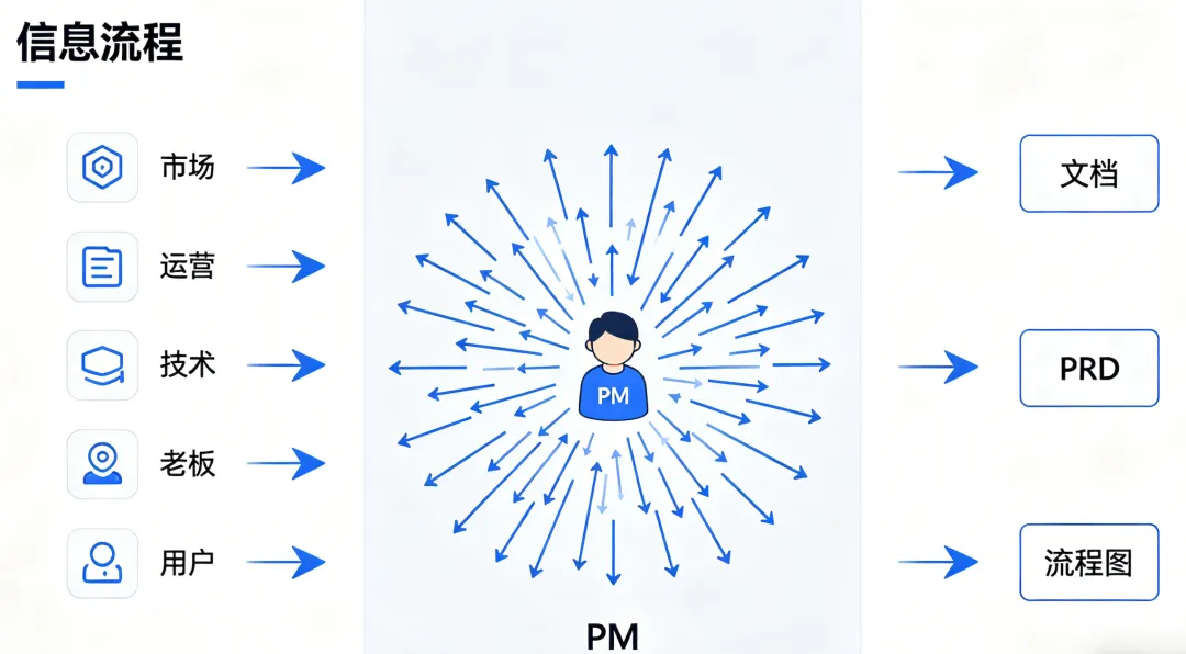 这个问题,我觉得不是哪个PM个人的问题,这是这个岗位的结构性问题。产品经理这个角色,从第一天开始就被设计成了一个信息中转站,你要接住来自市场、运营、技术、老板、用户的各种输入,然后输出文档、方案、流程图PRD。你每天处理的信息量,一点不比做研究的人少,但你真正的核心能力,其实是判断,判断什么值得做,判断方向对不对,判断优先级怎么排。