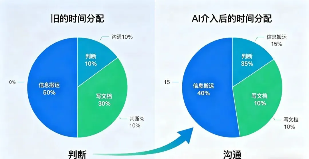 但让时间重新分配,意味着你原来花在做信息整理上的时间、花在做文档初稿上的时间、花在做低水平重复劳动上的时间,被AI压缩掉了,然后你把这些时间放到真正重要的事情上,判断方向、对齐策略、思考用户体验。