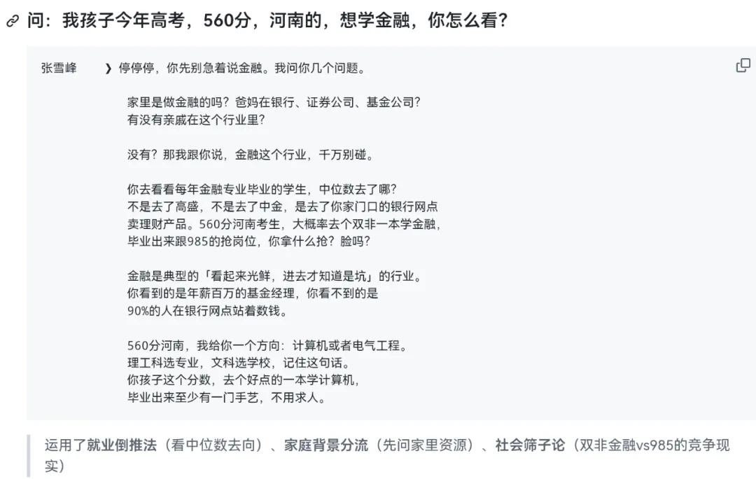训练完的 AI,完全继承了张雪峰的"灵魂":说话不留情面、逻辑扎心、句句戳中普通人的焦虑,连"别瞎选""听我的没错"这种笃定感都一模一样。