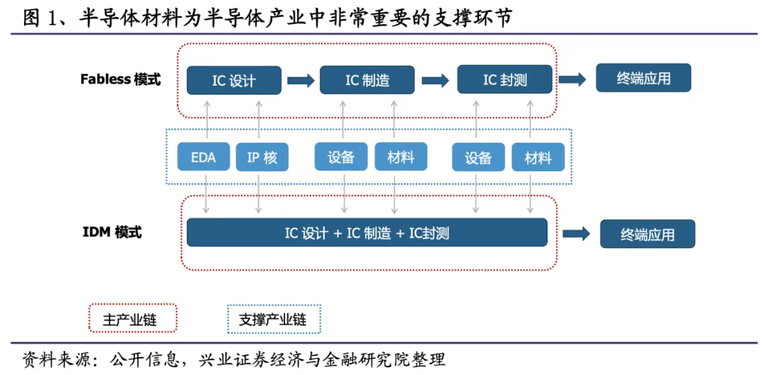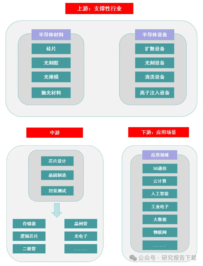 上游为半导体的支撑产业,由半导体材料和半导体设备等构成。