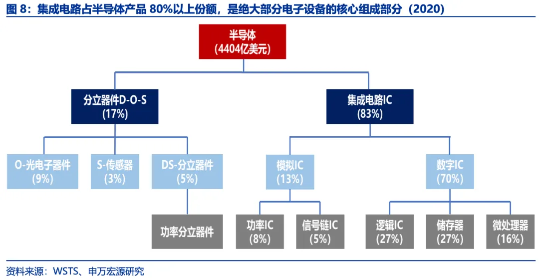 半导体产品(Semiconductor Products):主要分为集成电路、分立器件、光电子器件及传感器四类。