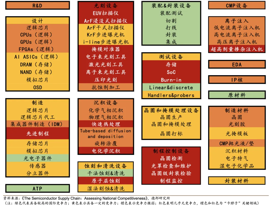 从全球区域分布来看,欧美在设计、设备绝对主导;美国在EDA&IP核一家独大;韩国主导存储IC设计;日本在DAO、设备优势显著;中国在封测代工环节占比最高。