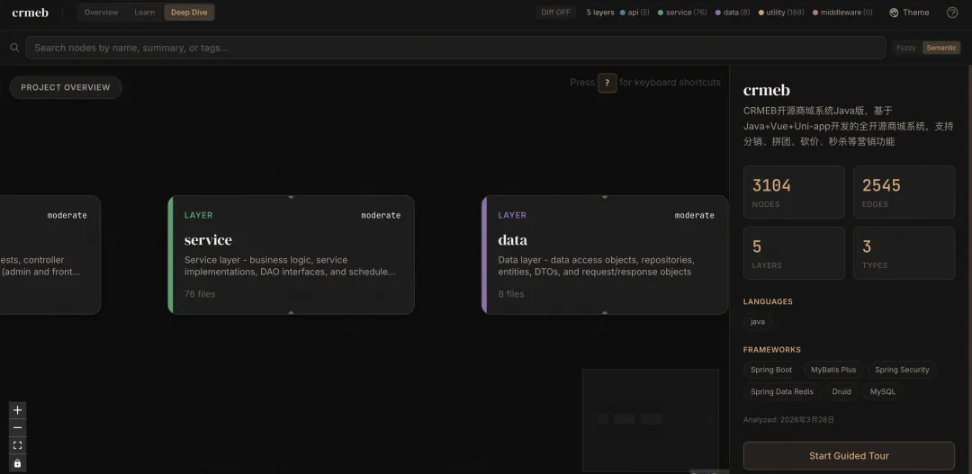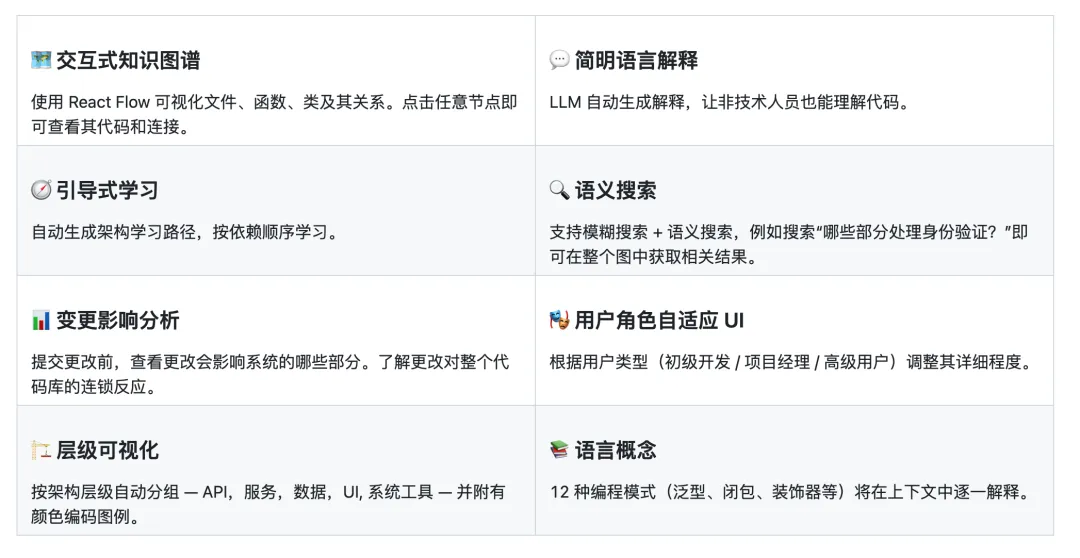根据作者仓库的介绍,它的功能不仅仅停留在可视化。语义搜索可以帮你迅速找到项目中处理身份验证的部分;变更影响分析让你在提交修改前知道可能波及的模块;引导式学习路径为你梳理系统架构;甚至根据不同角色自动调整界面,让每一位使用者都能高效上手。