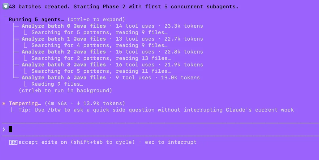 接下来它开启了5个并行的agent,阶段2的分析,它创建了43个批次进行分批处理: