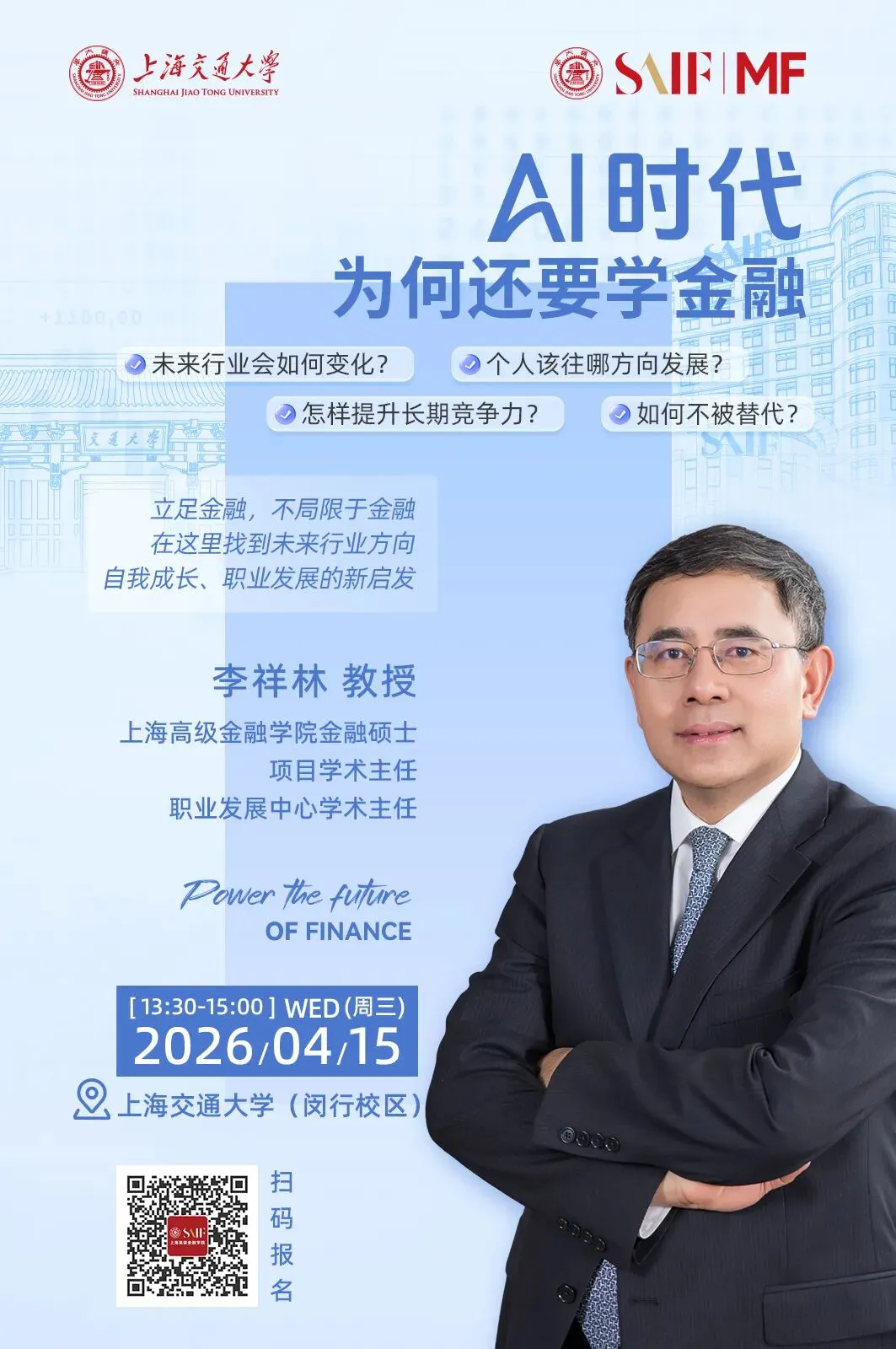 带着这些问题,本年度交大高金金融硕士 ·「走进校园」系列再度出发,特别邀请交大高金金融硕士、职业发展中心学术主任李祥林教授,带来《AI时代,为何还要学金融》主题分享。李祥林教授拥有数十年华尔街及国内金融高管经验,长期身处全球金融与金融教育变革的一线。这一次,他将不只讲“金融”,而是从更宏观的视角出发:从AI时代的人才需求与产业变化出发,结合金融作为国家发展的基础性力量,聊一聊在AI急速演进的时代,如何理解趋势、拓展认知边界,成为为具备长期价值与不可替代性的复合型人才。