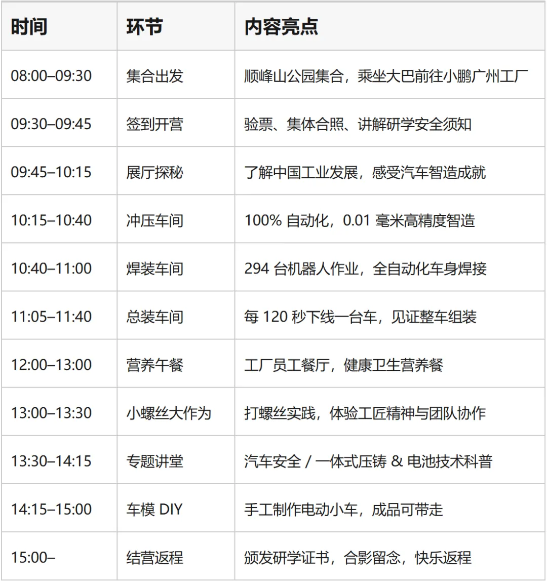 汽车产业是国家制造业核心支柱,彰显科技与工业实力。十年间,中国新能源汽车渗透率从0.4%跃升至50%以上,稳步迈向汽车强国。顺应 “制造业当家” 浪潮,小鹏汽车打造 X-FUTURE 智能制造研学,把前沿生产线变成移动课堂,让青少年近距离感受中国智造力量。
