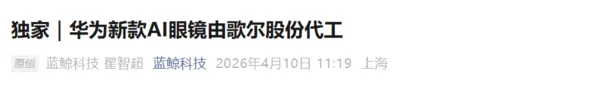 4月10日,据蓝鲸新闻报道,华为新款AI眼镜由歌尔股份代工。据CNMO了解,近日,华为终端BG首席执行官何刚发布一张图片,图片左下角标注 “ HUAWEI AI Glasses”。这一细节引发外界对华为新款AI眼镜的诸多猜测与关注。