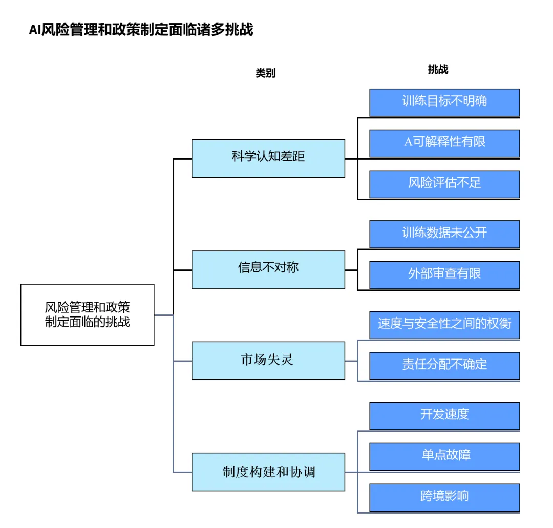 AI的发展速度使政府、研究和学术机构难以有效测试并及时发现AI风险相关的依据,难以建立有效的应对措施。有些机构难以拥有足够的技术能力和资源参与AI的研发,还有些机构可能尚未充分认识到通用AI发展的规模和对社会的影响。此外,少数基础模型被不同行业和不同国家广泛应用,引发了协同问题和整体依存关系问题。