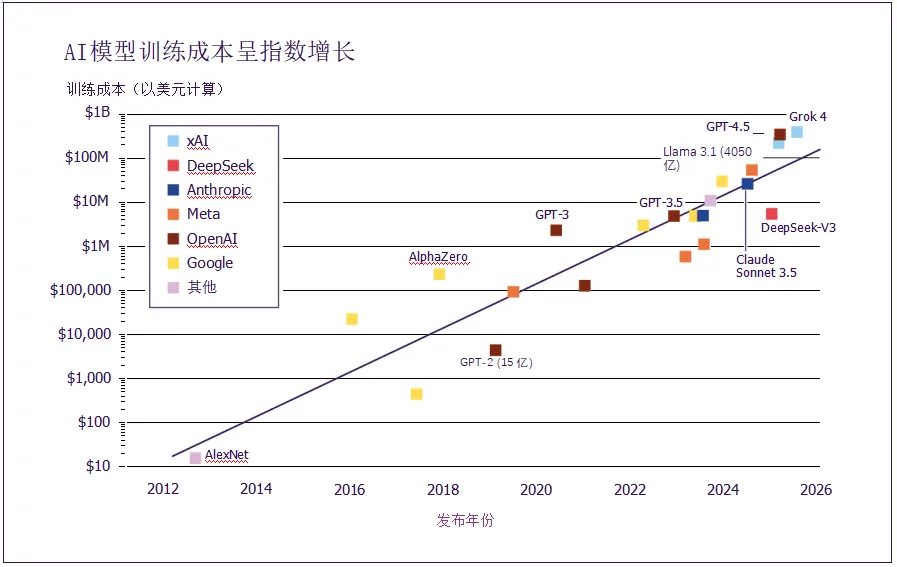 图3.2:AI模型预计训练成本,2012-2025年。来源:Epoch AI,2025 年。