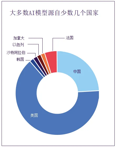在众多行业和用例中部署数量有限的通用AI模型,会在整个AI生态系统中造成共享问题。目前,医疗、金融、教育等领域应用的AI模型主要由美国和中国开发(见图3.3),累计影响数十亿用户。当同一模型支持多种应用时,模型中的异常会影响所有依赖于它的应用。因此,单个漏洞可以导致多个领域应用的模型同时出现故障并造成损害。即使是表面上独立的模型,也可能由于模型趋同而出现相同的漏洞,因为独立开发的系统处理信息的方式相似。