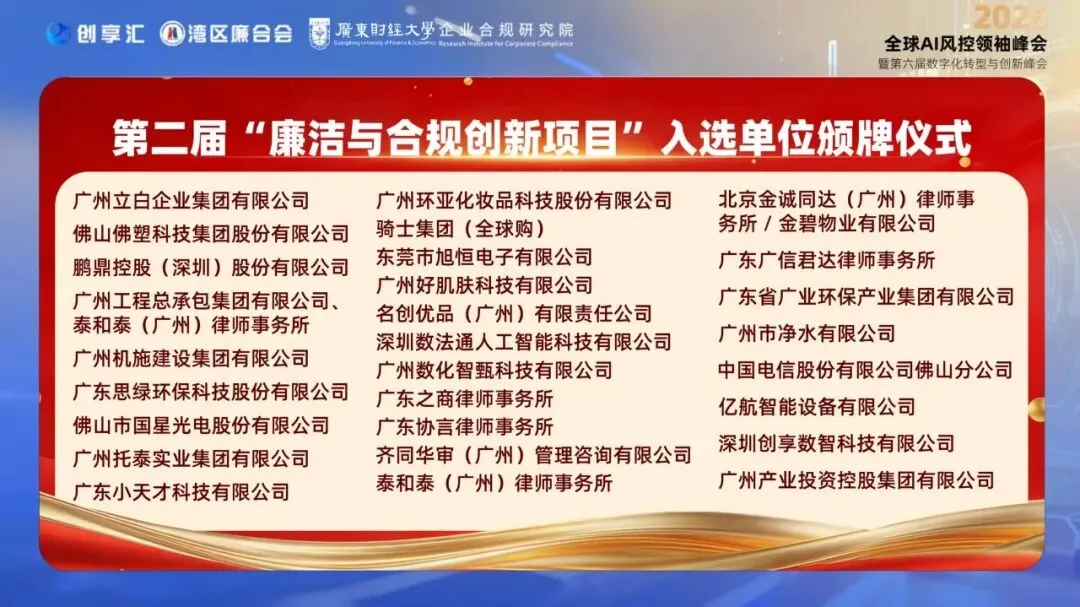 这些标杆项目以技术赋能合规、以创新重塑治理,为行业提供了可复制、可推广的实践范本,标志着企业合规治理正朝着数智化、体系化、精细化的方向加速迈进。授牌仪式也激励更多企业投身廉洁合规创新,助力大湾区营造健康有序、公平高效的良好营商环境。