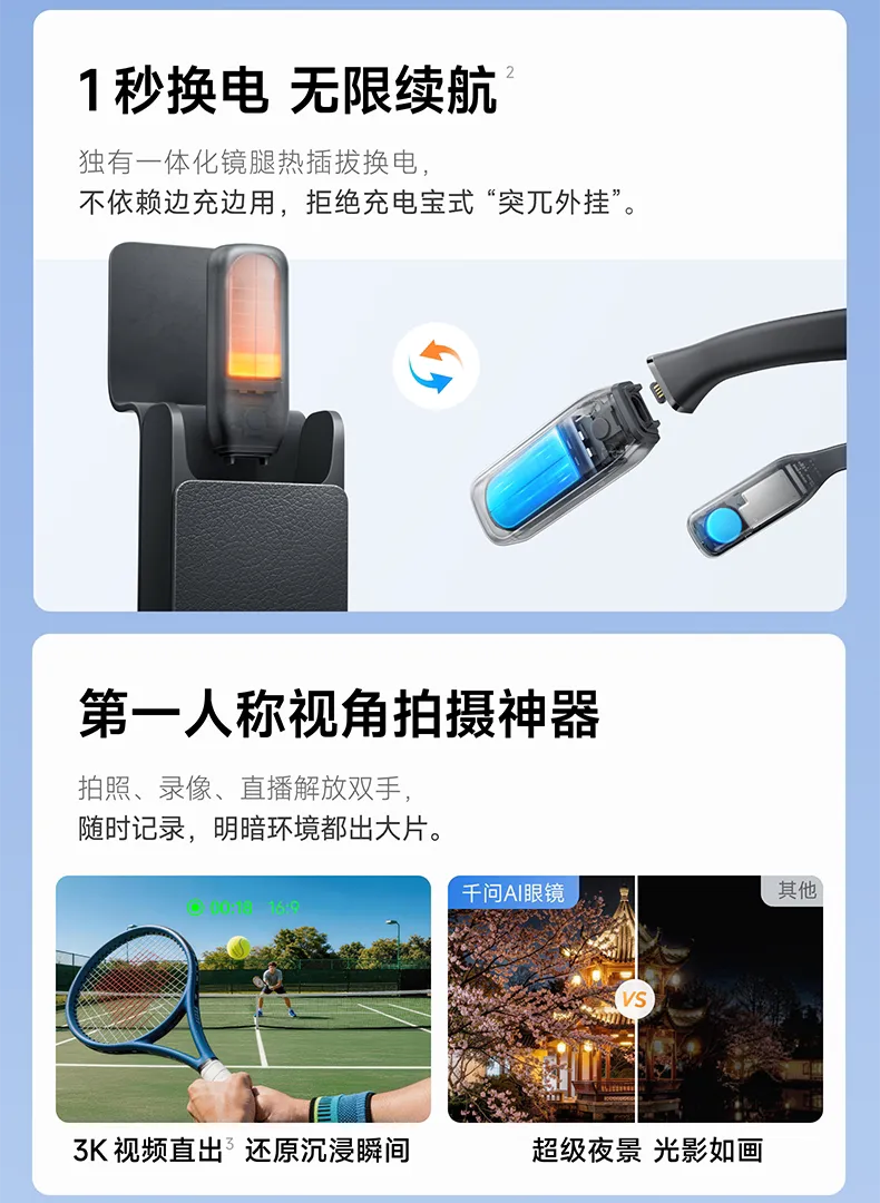 千问 AI 眼镜 S1 采用双电池结构设计,支持热插拔换电功能,无需关机即可快速完成电池更换,配合专用换电仓使用,能够满足全天候续航需求。设备配备 1200 万像素摄像头,支持 3K 分辨率视频录制以及超级夜景拍摄功能。音频方面采用双音圈扬声器、五麦克风阵列搭配骨传导方案,即便在嘈杂复杂的环境中,依然可以保证清晰准确的语音输入与稳定的音频输出。