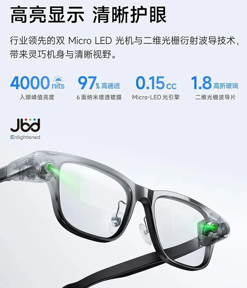 硬件配置上,千问 AI 眼镜 S1 搭载高通骁龙 AR1 芯片与低功耗协处理器,内置 32GB 存储空间,配备两块容量为 287 毫安时的电池,综合续航时长可达 7 小时。显示部分采用双显双 Micro LED 光机,入眼峰值亮度达到 4000 尼特,带来更清晰的视觉呈现效果。