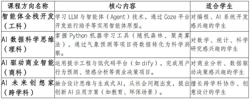 课程围绕四大方向展开,构建完整AI能力体系,覆盖技术、数据、商业与创新多个维度。不同兴趣背景的学生,都能在其中找到适合自己的路径。