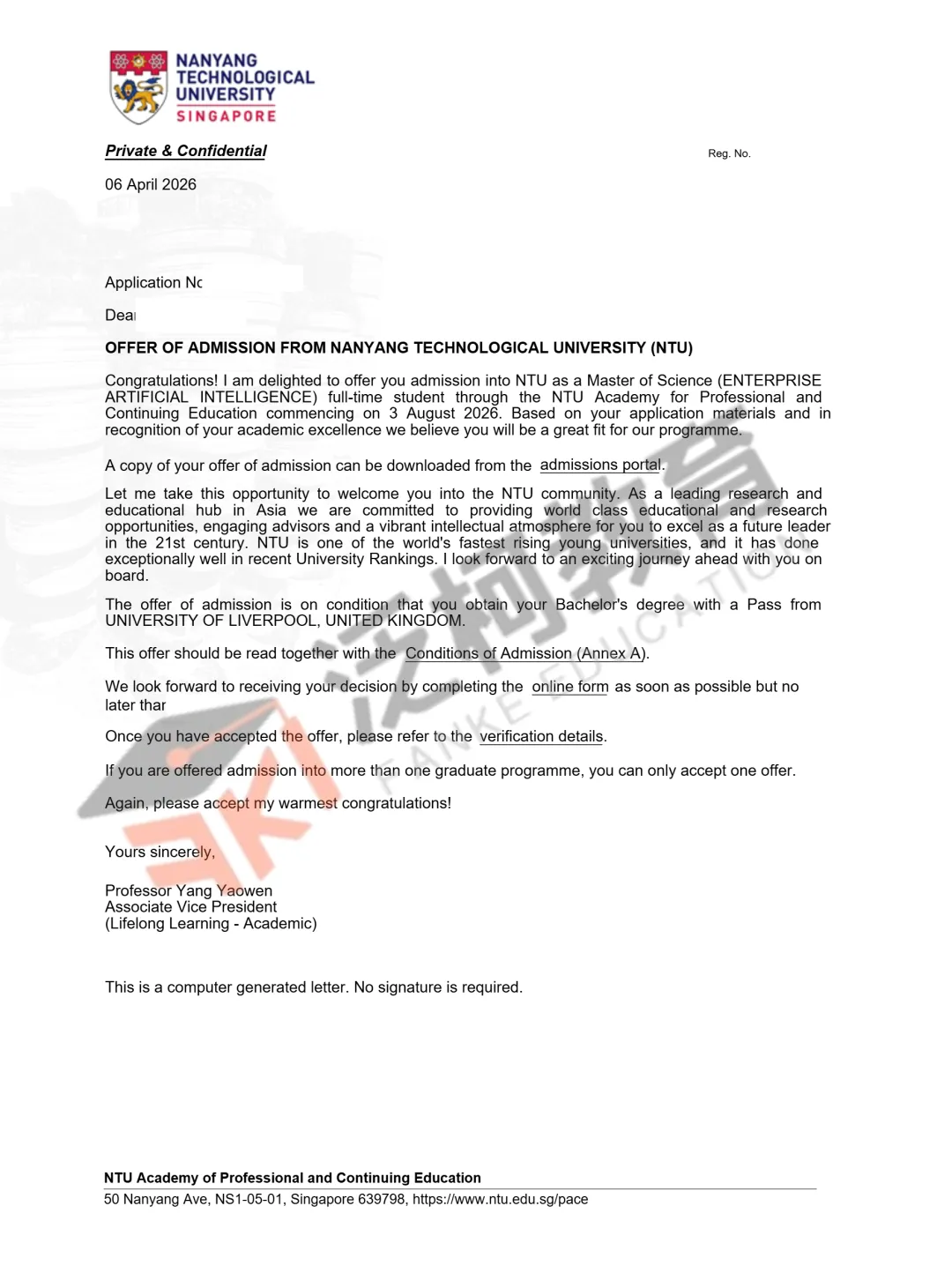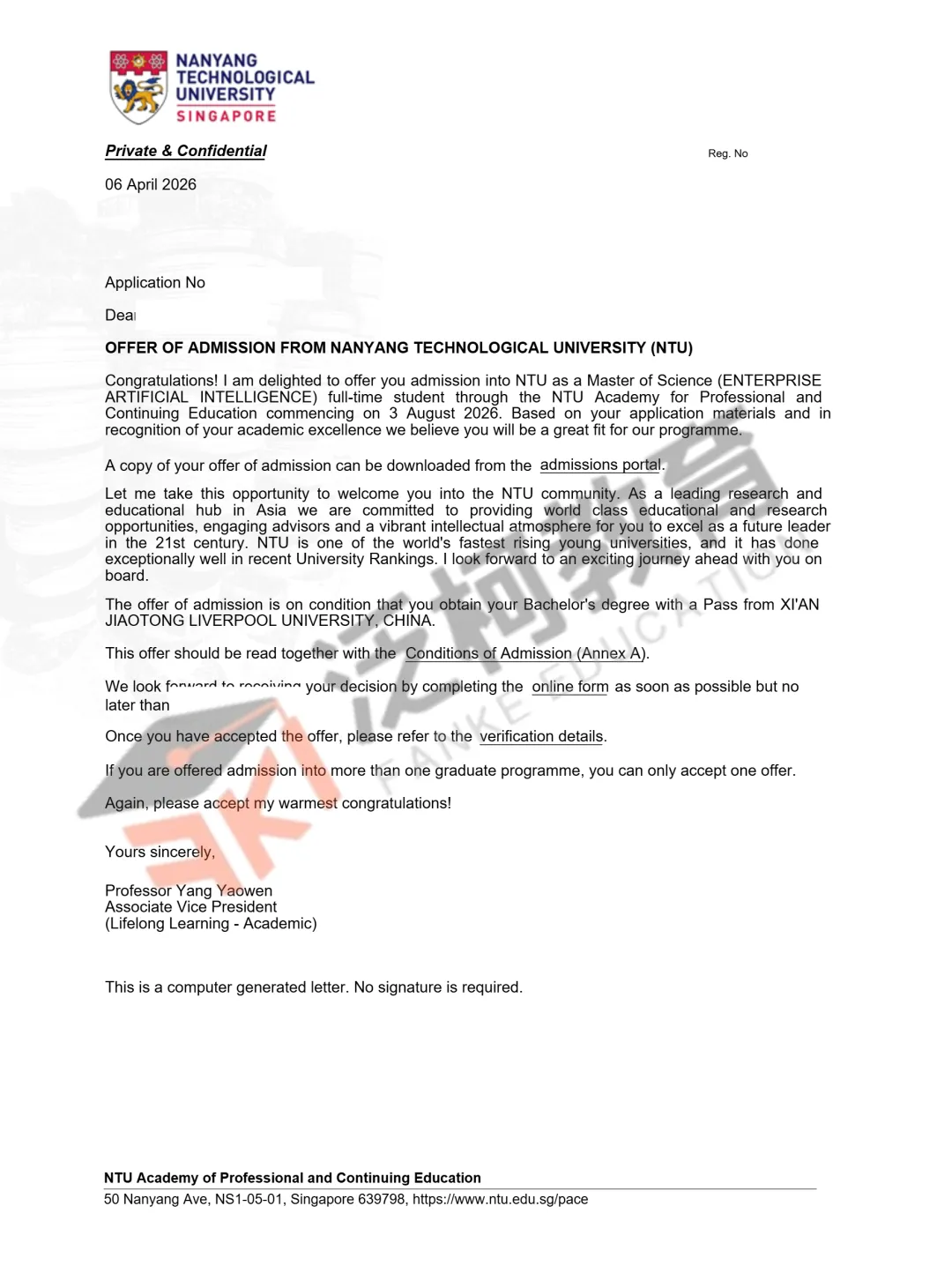 录取押金:S$5,000 新元(用于抵扣首期学费)。