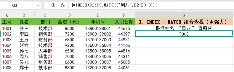 MATCH 部分:MATCH("周八”,B2:B9,0)=找 “周八” 在姓名列里是第几行