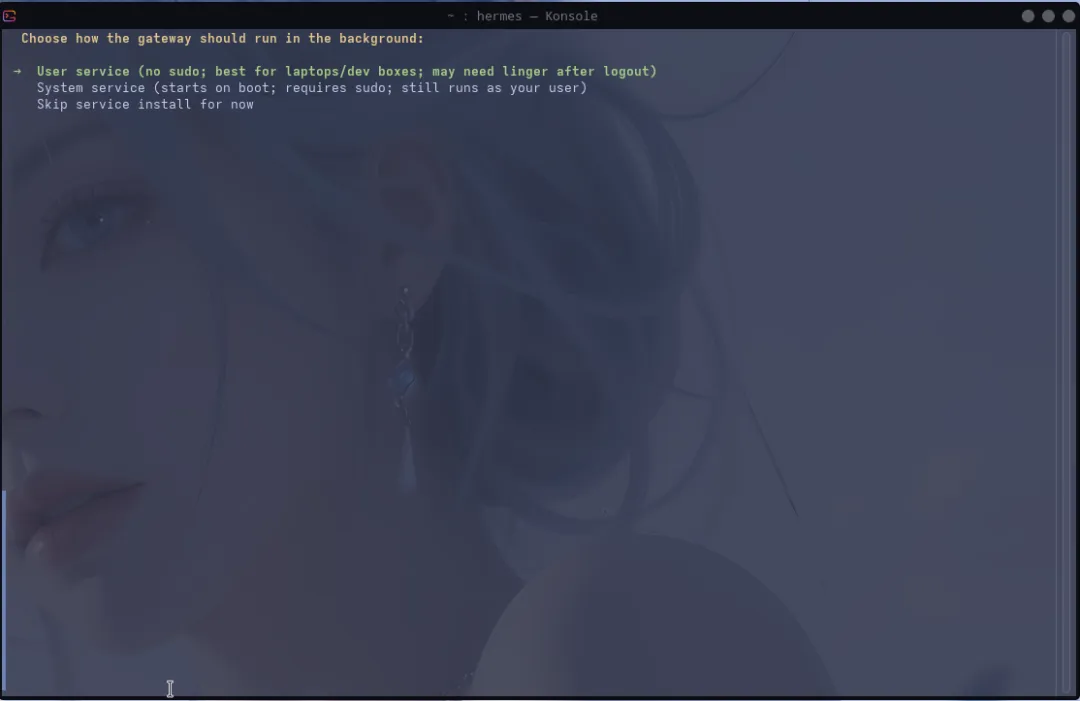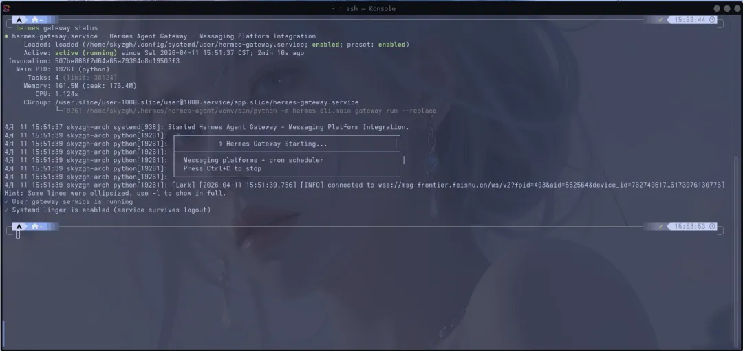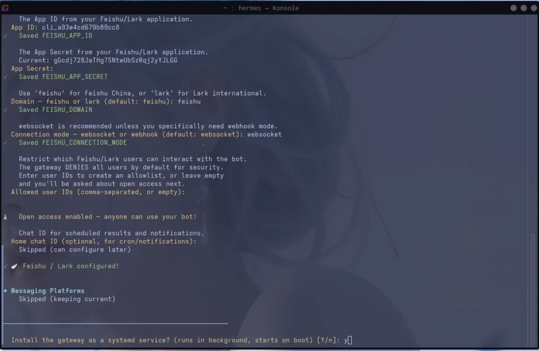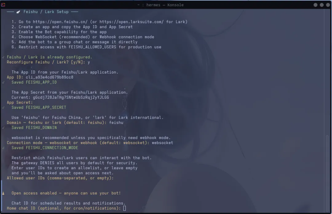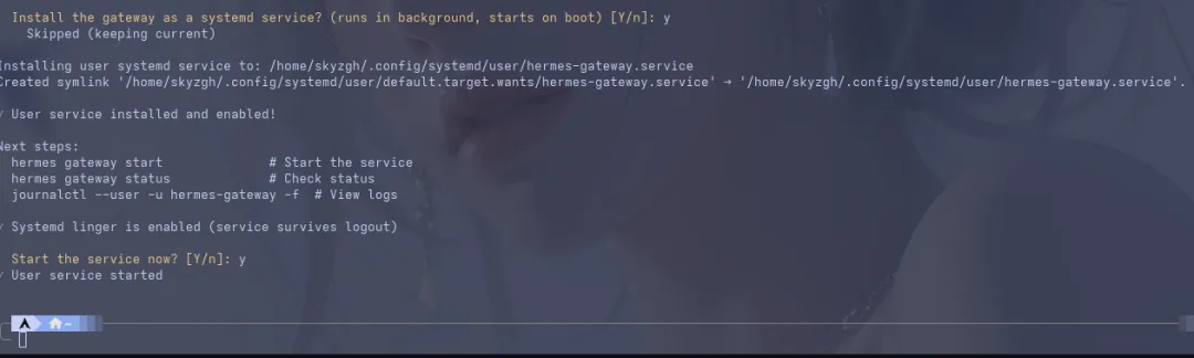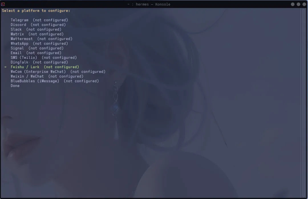 执行完官方安装命令,我是手动进入了 hermes model模型设置和通道设置hermes gateway setup。特别是配置飞书的时候,官方安装脚本是没有飞书选项的,但是单独执行 hermes gateway setup又有飞书选项。本文26年4月11日更新,后续官方安装脚本可能变化,提示界面会发生变化,但是大体应该差不多。 我的安装环境是archlinux应该在linux环境安装都差不多。