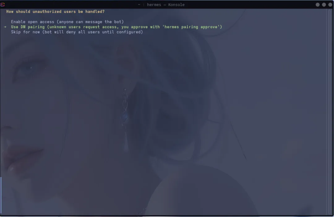 启用开放访问(任何人都可以给机器人发消息) 使用私聊配对(未知用户需申请访问权限,你通过 hermes pairing approve命令批准)暂时跳过(机器人将拒绝所有用户,直到完成配置)