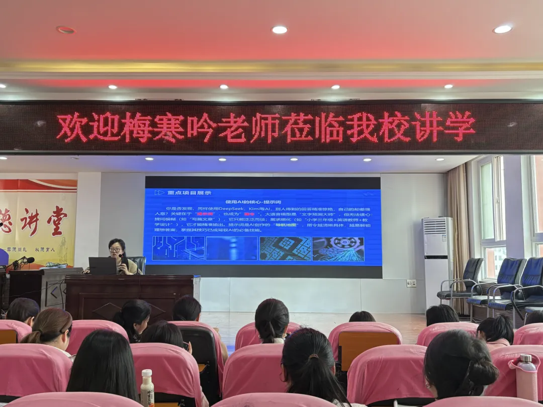 本次培训特邀驻马店市驿城区刘阁中心小学梅寒吟老师主讲,采用“理论精讲+实战演练”双轨模式。培训伊始,梅老师从AI技术底层逻辑出发,结合新课标要求,系统阐述了人工智能在教学诊断、个性化辅导、资源开发等核心场景的应用价值,打破教师对AI技术的认知壁垒。